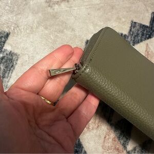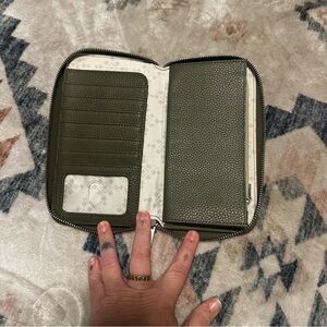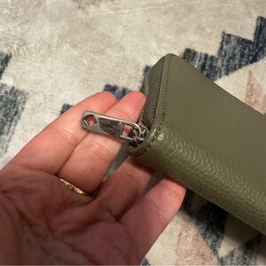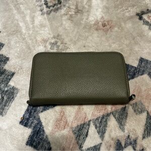 Stylish olive green wallet with zip closure. Features multiple card slots inside.