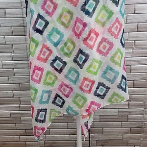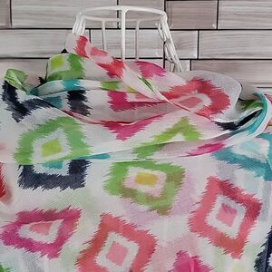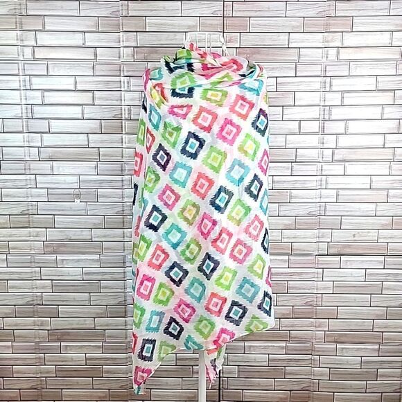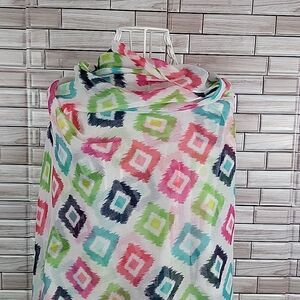 Abstract artsy bright colored square print summer scarf by Thirty one in a versatile size to wear as a wrap or a scarf. Great pre-owned condition.