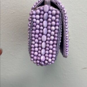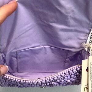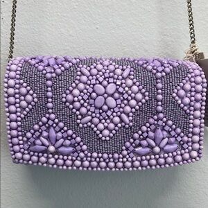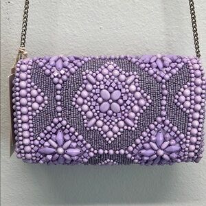 Clutch features intricate beadwork in a captivating purple shade, 💜 forming a stunning geometric pattern. The art deco-inspired design is complemented by a metallic chain strap, perfect for adding elegance to any evening look.