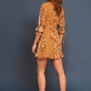 Heat things up. This is a mini length dress with a deep v neckline, center front buttons, 3/4 sleeves and a ruffle edged hem. The Scarlett is fitted throughout the bodice with an easy fitting skirt.
