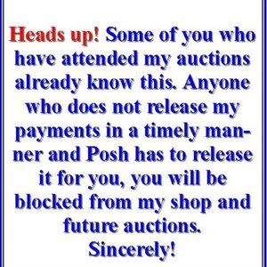 My Posh stats show that I am a fast shipper. My average time for shipping a purchase is 1 day and not the 3 days that Posh allows! If I make the effort to ship promptly, the buyer should return the favor and release my payment promptly! If Posh has to release my payment for you, then you can take your money and spend it with those sellers who don't ship an items until 3 days! Sincerely GenuineVintage!