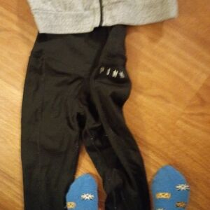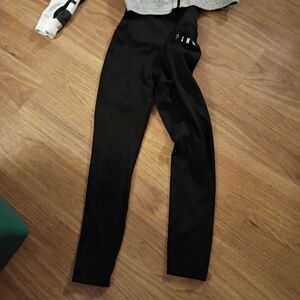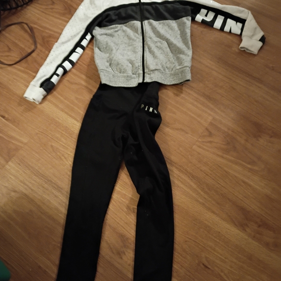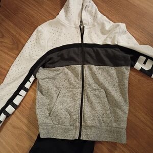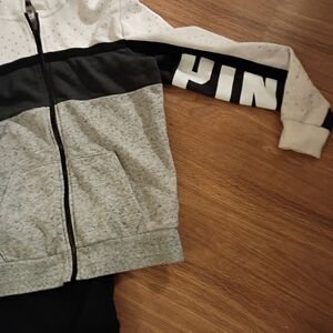this is a two-piece size small Victoria's secret Pink outfit includes black leggings and a white gray and black bling full zip hoodie hoodie is missing the string though