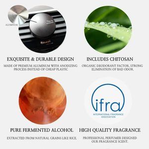 Package includes 1 reusable car air freshener, 1 blotting paper, 1 non-slip gel pad and 0.5 oz (15ml) essential oil in a simple gift box.