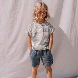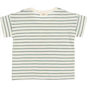 Short sleeve stripes T-shirt with print design in the center. Round neckline with button tab closure on left shoulder with two buttons. 100% Organic Cotton Portuguese fabric Made in Portugal
