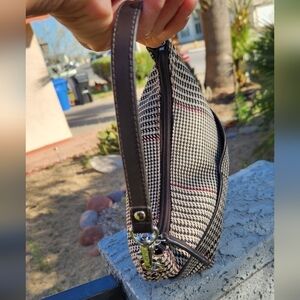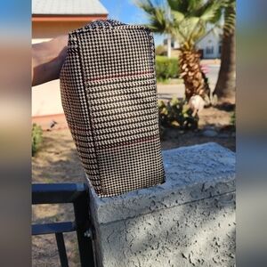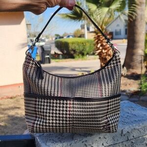 This Lauren Ralph Lauren vintage hobo shoulder bag is a timeless piece with a classic houndstooth pattern. The bag is made of tweed material with brown, black, and red colors on the exterior. It has a top handle with a brown leather strap and a detachable shoulder strap. The bag measures approximately 11 inches in width, 9 inches in height, and 4 inches in depth.