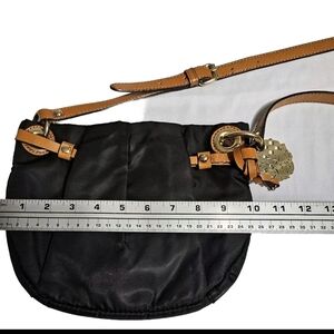 This Vince Camuto Black Women's Evening Casual Party Small Crossbody Sling Bag features a solid black exterior made of polyester with a semi-circle shape and a snap closure. The bag has a brown leather crossbody strap with gold-plated hardware accents, including a strap accent and zipper. It is designed for various occasions such as travel, casual outings, and business meetings, and includes a polyester lining in black, an adjustable strap, brand card, and bag charm. The small size and multicolor exterior make it a stylish and functional accessory for women on the go.