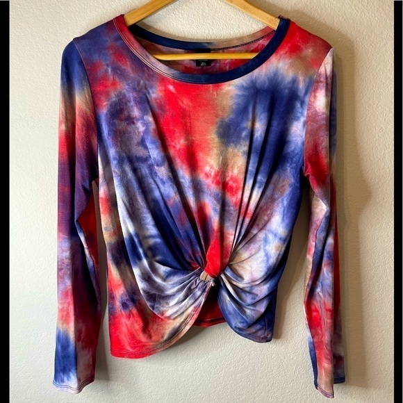 This and More Young Contemporary Long Sleeve Red Blue Tie Dye Twist Front Shirt