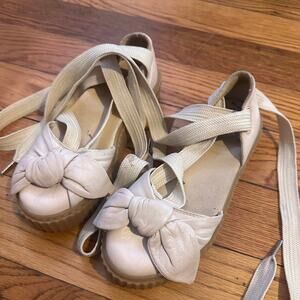 This is a Fenty x Puma Bow Creeper Sandal in the Natural/Oatmeal colorway Pink & cream Puma platform sandals