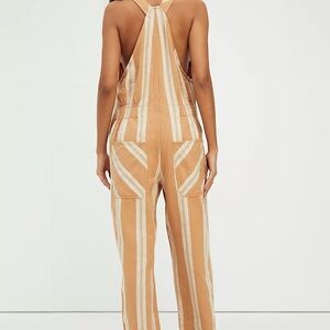 This is a Free People Beach Dune Stripe Linen & Cotton Oversize Overalls in Tan