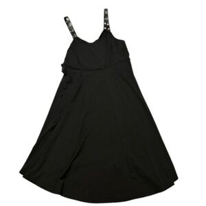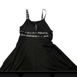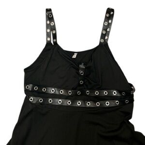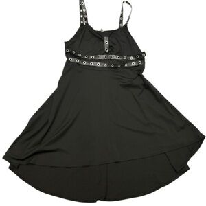 This is a NWOT sleeveless high low black A-line dress by Rosegal, featuring leather with grommets accents. It is a size XL made of polyester material. The dress has a pullover closure and is machine washable. It is suitable for casual occasions and has a high low length.