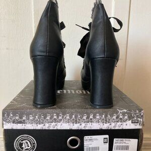 Heel and Sole: The heel is designed as a chunky high heel, significantly elevating height while offering relative comfort due to the stability of the thick heel. The sole is platform-style, further increasing height and enhancing the shoe's retro and gothic aesthetic.