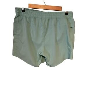 This product is a pair of women's Reebok athletic shorts in size medium, in a vibrant mint green color. The shorts feature a drawstring closure for a customizable fit, a liner inside for added comfort, and a convenient pocket on the right side. Perfect for active occasions, these athletic shorts have a 5-inch inseam and are designed in a stylish and functional athletic style.