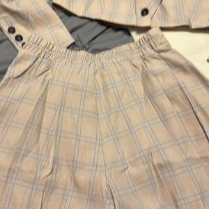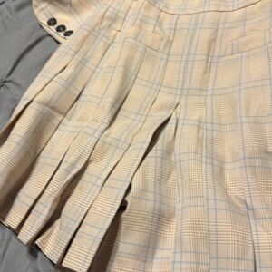 Cream, tan and blue stripes. Shirts have pleated front to look like skirt. Side zip. Elastic waist. Waist when flat is 12 inches. Inseam 4.75. Waist to hem 16 inches. Jacket has retro V with button. Shoulder pads. Long sleeves. Faux pocket. Pit to