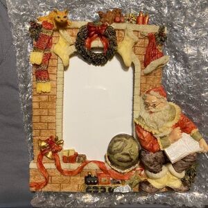 * This Christmas picture frame features frame scene covered in ornaments, bows, and gifts, along with a brown cat overlooking Santa and Santa Claus holding naughty or nice list