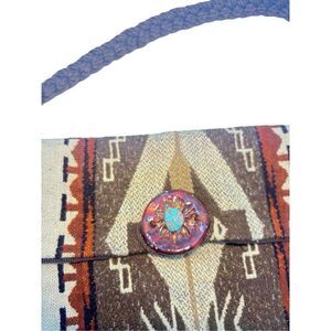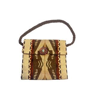 This is a bohemian-style shoulder bag with a braided strap. The bag features a geometric, tribal-inspired pattern in earthy tones, including beige, brown, and rust. It has a flap closure with a decorative button that appears to have a floral design and a small turquoise-colored centerpiece. The overall look is rustic and handcrafted.