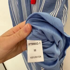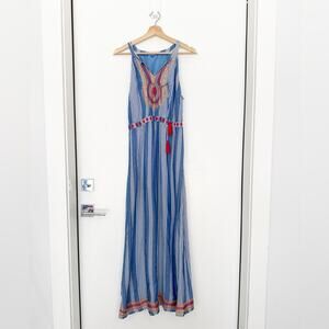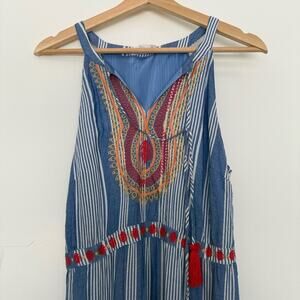 Make a statement in this beautiful bohemian-inspired maxi dress! This flowy sleeveless dress features a vibrant blue and white vertical stripe pattern, perfect for a sunny day. The bodice is adorned with stunning multicolored embroidery in a floral pattern, adding a pop of color and intricate detail. It has a high halter neckline and red tassel details that hang from the front, bringing a touch of fun and whimsy. The elasticized waist creates a flattering silhouette, and the lightweight fabric is ideal for staying cool and comfortable. Perfect for a resort vacation, a beach day, or a casual summer outing.