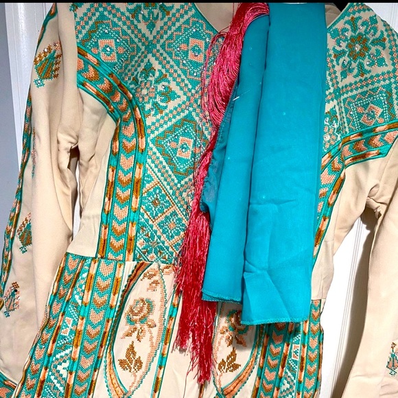 Middle eastern/ Jordanian thobe dress. Beautiful colors size small equivalent to size 4/6. Comes with belt and scarf. A line cut. Middle eastern dress.