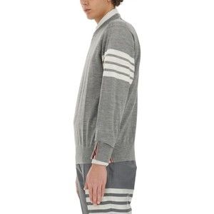A classic pullover crafted from 100% virgin wool, this piece exhibits a subtle grey hue. It features a relaxed yet tailored fit, showcasing a crew neckline and long sleeves adorned with the iconic four-bar striped detail. This versatile item is a timeless addition to any wardrobe, perfect for both casual and sophisticated styling.