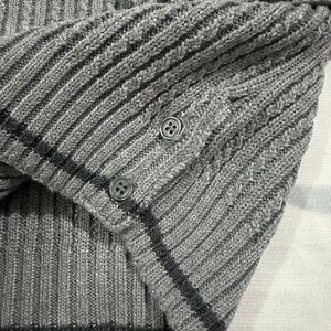 Thom Browne women's black four-stripe cardigan. Gray V-neck knit jacket.
