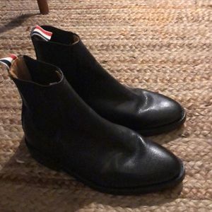 Designed from smooth calf leather, these Chelsea boots from Thom Browne show a traditional design. With the practical slip-on style, the pair has the signature tricolour detail as a rear pull tab.