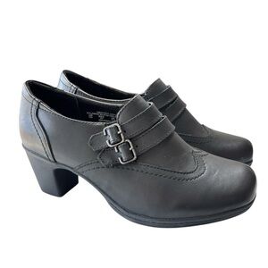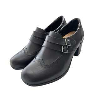 Thom McAn Black Clover Heeled Shoes Size 8.5 W Black Leather Ankle Bootie Buckle