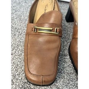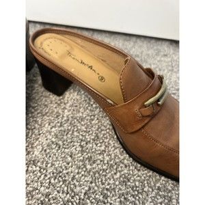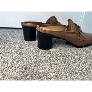 Leather Brown loafer style slip on heel. Size 9. These are pre owned condition, please see photos. A few minor show of wear, but overall a beautiful shoe!
