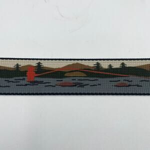 Thomas Bates web belt featuring a detailed fishing, camping, and scenery design. This adjustable belt is perfect for outdoor enthusiasts and showcases a classic lockbox design. Made in the USA, it combines durability and style.