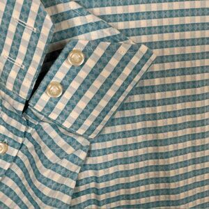 Thomas Dean Button Front Shirt Teal Blue and White Diamond / Stripe Print Size Medium. Excellent condition. See photos for details and unstretched measurements. View my closet to add other items and bundle to save with one shipping fee!