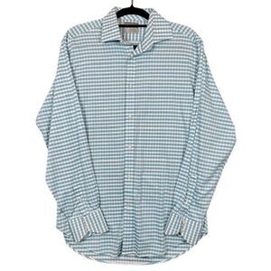 Thomas Dean Button Front Shirt Teal Blue and White Diamond Print Size Medium