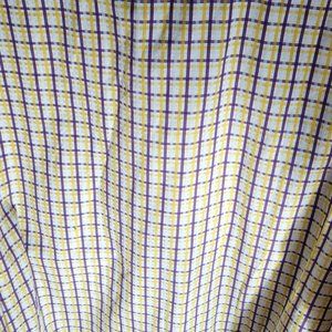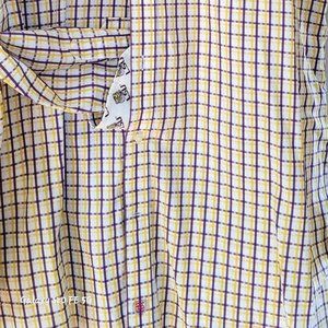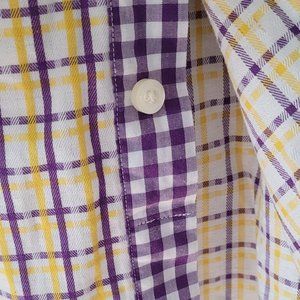 The collar and inside cuff have different logo print material, and the button strip is of a matching purple and white check print (see print).