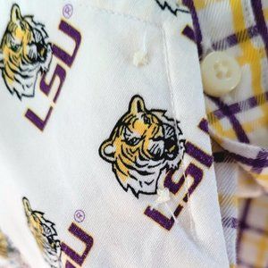 The LSU logo is embroidered in several places on the shirt: chest and cuff.