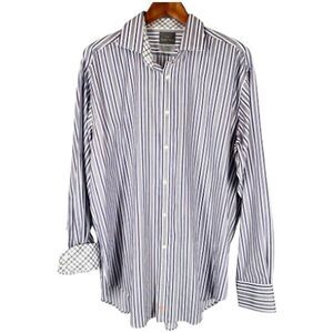This premium quality Thomas Dean shirt features purple and grey skinny stripes on a white background, with contrast print flip cuffs and collar. It has long sleeves and a spread collar with branded collar stays. A subtle texture and comfortable non fray flat seams offer quiet luxury. It's perfect for a party, workwear, church or the office. New, no tag!