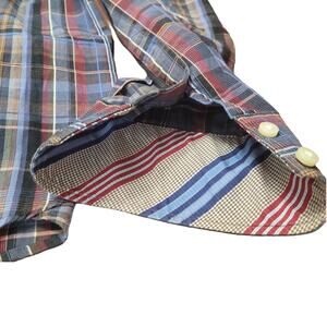 Thomas Dean men’s button-down dress shirt in classic autumn plaid. Features bold tones of navy, yellow, tan, red, and light blue with contrast striped cuffs and collar trim. Finished with chunky buttons, orange logo embroidery at hem, and a starched collar for structure. Made from 100% sustainable cotton shirtmakers cloth, offering both durability and comfort. Perfect mix of preppy and modern city style, versatile for office wear or casual layering. Excellent condition, gently worn with no flaws.
