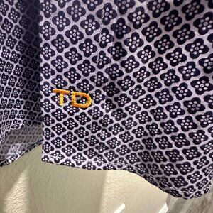 Features a sharp blue/purple paisley pattern with stylish contrast print inside the collar and cuffs, plus signature “TD” embroidery near the hem.