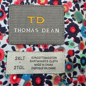 The Thomas Dean Multicolored Floral Dress Shirt for Men in size 2XLT Tall features a stylish design with a collared neckline, button closure, and long sleeves. Made from 100% cotton, the shirt has a woven fabric wash and a colorful multicolor floral pattern, perfect for various occasions like parties, casual outings, or business meetings. The shirt also includes a unique flip cuff and embroidered accents, adding a touch of sophistication to the overall look. Ideal for those looking for a regular fit with a touch of colorful style.