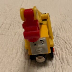 Kevin the Construction Crane. The Red with the Yellow Crane Moves Up and Down. Silver Barrel Spins. Wheels Run. Magnets on Each Side to Attach to other Trains. His Name is Kevin. He is Plastic. About 5-1/2" long.