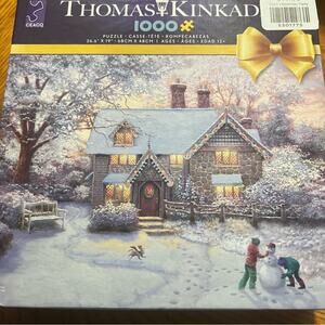 Thomas Kinkade 1000 Piece Jigsaw Puzzle Christmas at Gingerbread Cottage Winter. Puzzle is in very good used condition. Has been put together once and all pieces are included inside a plastic baggie. Please see close-up pictures for condition details. Snow. Snowman. Christmas lights. Snowy scene. Holiday. Festive.