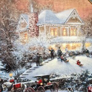 These vintage collector plates from Thomas Kinkade depict idyllic winter scenes with golden light and intricate holiday details. Ideal for seasonal decoration or display, their nostalgic charm evokes a bygone era of festive gatherings and snowy evenings.