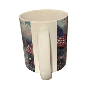 This ceramic coffee mug features a vintage-inspired design by Thomas Kinkade, known for his nostalgic and patriotic artwork. The mug showcases a detailed depiction of American flags waving majestically over the Capitol under a dramatic sky, evoking a sense of historical grandeur and national pride. Ideal for collectors of Americana art.