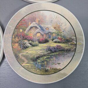 Transport yourself to a serene countryside with this exquisite set of four coasters, each adorned with a picturesque cottage scene by the renowned artist Thomas Kinkade. These coasters not only protect your surfaces but also bring a touch of artful elegance to your home decor. Backed with cork for stability, they are both beautiful and functional.