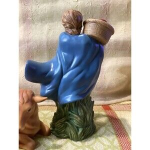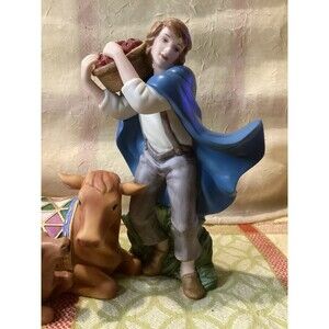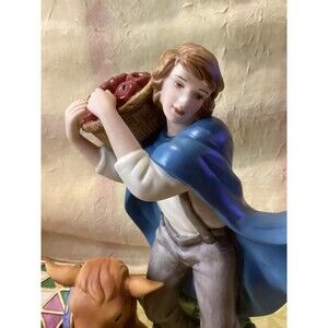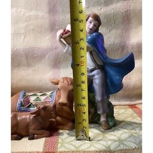 The Thomas Kinkade Hawthorne Nativity Cow Watching Over Her Young & Devoted Peasant is a beautifully crafted ceramic and porcelain Nativity figure set that includes a cow with calf. Designed by artist Thomas Kinkade, this multicolored piece is part of the Hawthorne Village Nativity collection and is perfect for Christmas celebrations. This collectible item from 2004 features hand-painted details and comes in its original packaging, making it a unique and heartfelt addition to any Nativity display.