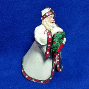 The Santa is dressed in a long white robe trimmed in red and green trim. The Santa is holding a wreath.