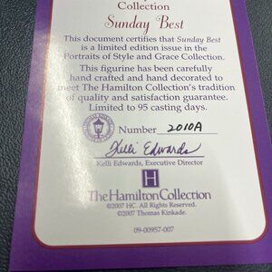 Thomas Kinkaid Portraits of Style and Grace Collection Sunday Best Figurine. Sculpture # 2010A. Used in packaging with Certificate of Authenticity. The Hamilton Collection. Certified that Sunday Best is limited edition issue in the Portraits of Style and Grace Collection. Beautiful figurine with lavender dress and red hat with feathers and flowers.