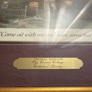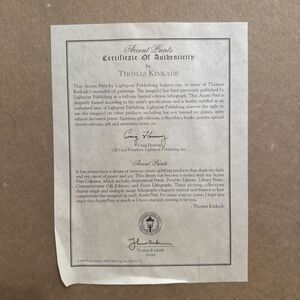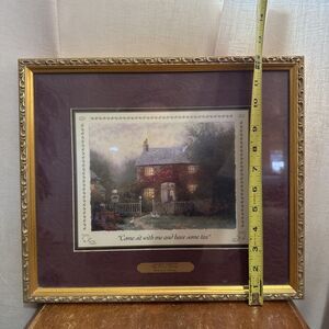 The product is a licensed reproduction canvas accent print of Thomas Kinkade's "Pye Corner Cottage," framed and measuring 14.5 inches in height and 12.5 inches in length. It was produced in the 1990s and comes with a certificate of authenticity.