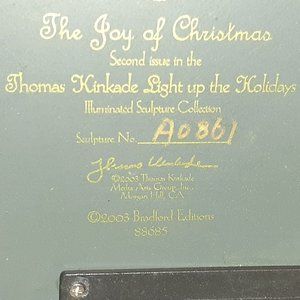 Thomas Kinkade The Joy of Christmas illuminated sculpture from the Light up the Holidays Series, 2nd issue, in 2003. It is 8 inches tall and 7 inches wide. It lights up above the painting as well as the star on the Christmas tree. Batteries NOT included. Smoke free home. Bundle 2 or more items to get a big discount from me!