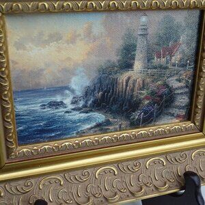 Thomas Kinkade The Light Of Peace Lighthouse Print, 9.5" x 7.5" Framed. Pre-owned good condition a chip observed and noted on top left of frame Pretty lighthouse landscape art print by the artist Thomas Kinkade matted and framed in a beautiful beveled cherry color wood frame! GenX approved.
