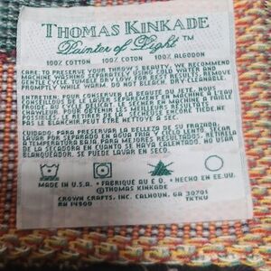Thomas Kinkade cottage house, made in usa, 100% cotton throw blanket, painter of light. in used condition. see pics for details of condition and measurements. a few pulls similar to the one shown.