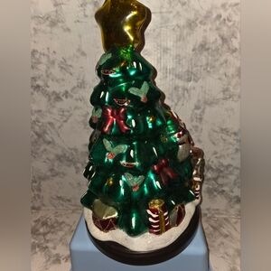Colorful blown glass Christmas tree featuring Santa, reindeer, and gifts. Perfect for holiday decor.