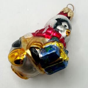 Thomas Pacconi Classics 2002 GLASS ORNAMENT, Penguin Santa Hat With Gift, 3.5”