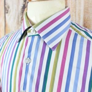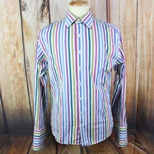 Thomas Pink Dress Shirt 15.5 Medium Long Sleeve Colorful Striped French Cuff